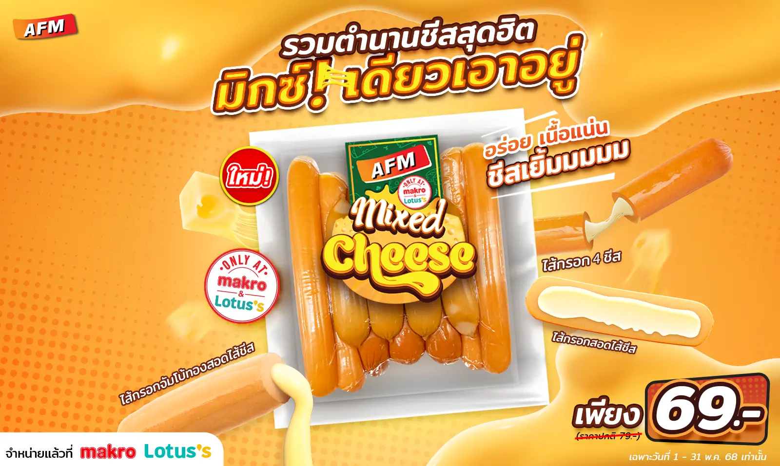 ถูกใจสายไส้กรอกชีสเลิฟเวอร์😋 AFM ไส้กรอกไก่หนังกรอบสอดไส้ชีส “แถมฟรี 2 ชิ้น!” ความอร่อยจนล้นถุง ระเบิดความฟิน ชีสแน่นจุใจ อร่อยได้ทุกเมนู✨ 📍พิกัดความอร่อย : Makro , Lotus’s Makro Pro : https://bit.ly/3FuMRfS Lotus’s : https://bit.ly/43JHjIo โปรโมชันตั้งแต่วันนี้ จนถึง 31